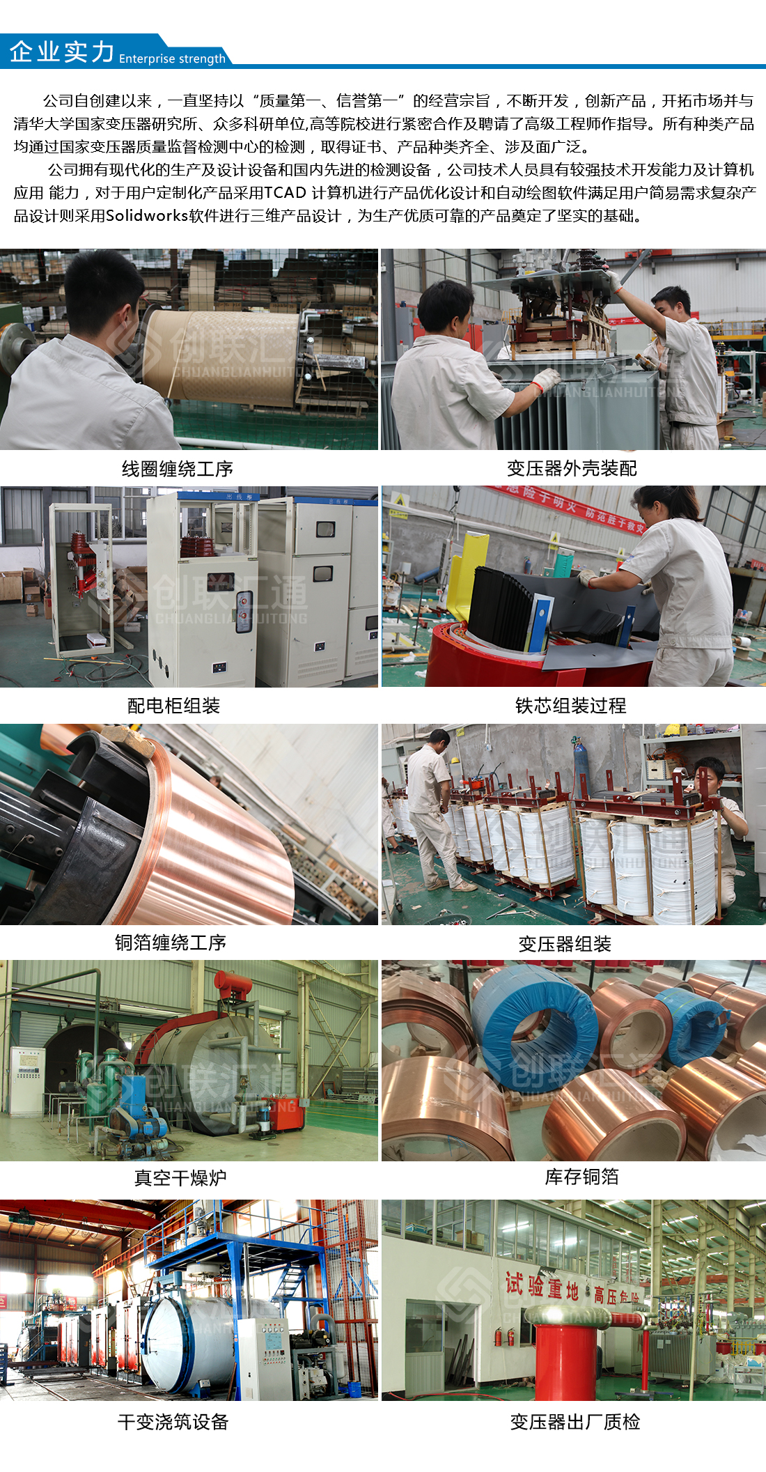 答 創(chuàng)聯(lián)匯通主營產(chǎn)品有:S11(13)、S20(22)新能效及SH15系列10KV級~110KV級油浸式電力變壓器、有載調(diào)壓電力變壓器、非晶合金變壓器、SC(B)10 (13)、SG(B)10(13)及SC(B)14(18)新能效系列干式變壓器、開關(guān)柜及組合式變壓器、箱式變電站及防竊電、礦用、整流、電爐等特殊電力變壓器。產(chǎn)品廣泛用于電力、核電站、交通、礦山、冶金、建...