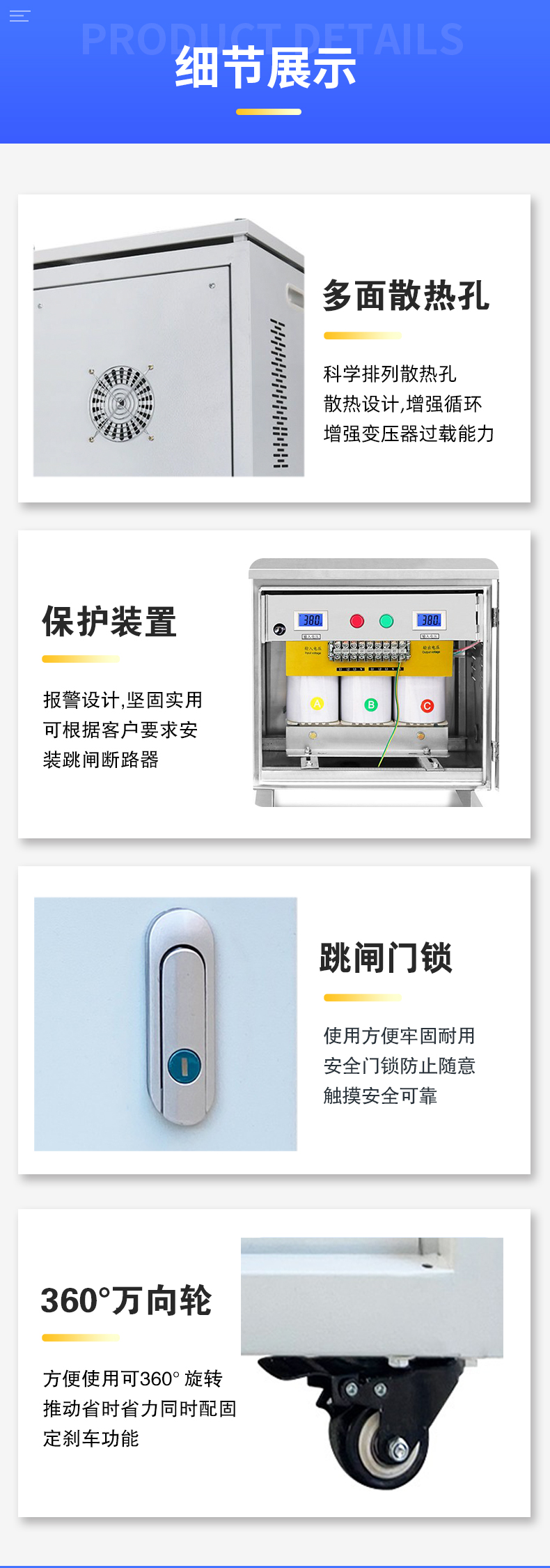 答 01全新硅鋼片噪音小,損耗低,運行穩定,壽命長02純銅線圈過載力強無氧銅線,穩定性更強,導電性能更好,抗短能力更強03浸水運行IP68防護等級,浸水運行穩定可靠04穩定可靠全密封,全絕緣的接線方式,高壓側帶熔斷保護...
